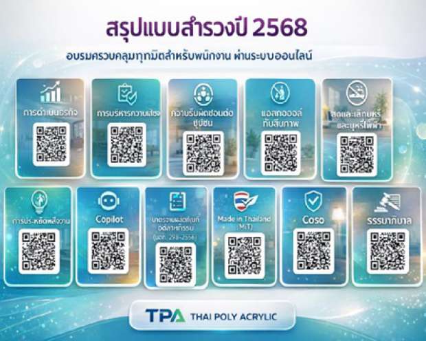 บริษัท ไทยโพลีอะคริลิค จากัด (มหาชน) ให้ความสาคัญกับการพัฒนาทรัพยากรมนุษย์อย่างต่อเนื่อง โดยในปี 2568 บริษัทได้จัดการอบรมประจาปีในรูปแบบ ระบบออนไลน์ (ONLINE TRAINING) เพื่อเปิดโอกาสให้พนักงานทุกระดับสามารถเข้าถึงองค์ความรู้ที่จาเป็นต่อการดาเนินธุรกิจ